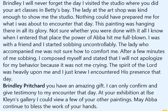 The Joy magazine did a lovely article on the painting. After about 6 months,at a social gathering, we buped into Ilze Kleyn, she was the then owner of “Die Boomhuis” the christian art gallery in Stellenbosch in the Western Cape, South Africa. She invited us that very night to bring our large painting to be part of a pesach exhibition that was to open a month later. Right there, I felt the Father say to me that this is what He wanted.